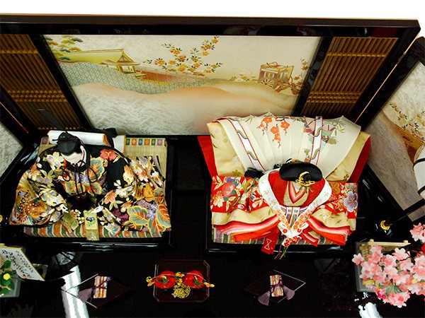 ・台座・屏風等には落ち着いた色目の雛人形セット。