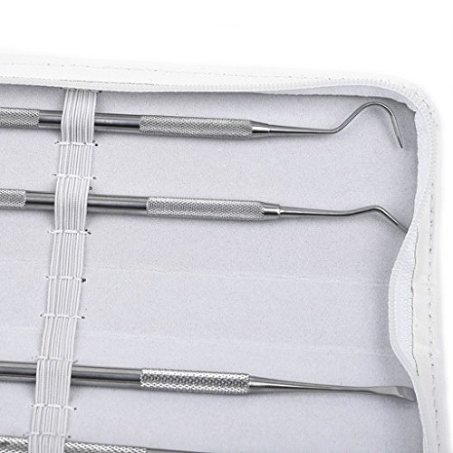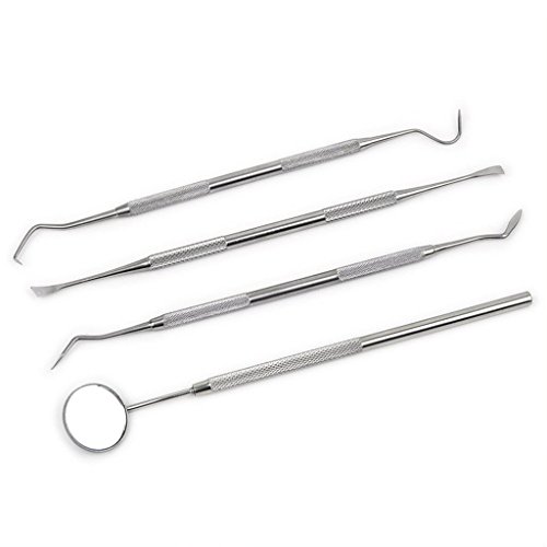 This 4 piece tarter scraper and remover set includes: 1 scraper, 2 scaler, 3 mirror, 4 probe. Each measures 6.81" long.