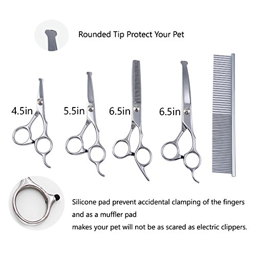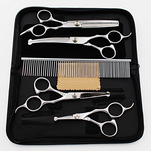 Studio : XUANYI ELECTRONIC Publisher : XUANYI ELECTRONIC Binding : Misc. Product Description You Will Receive: Straight Scissor 4.5'× 1 5.5'× 1 Curved Scissor 6.5'× 1 Thinning Scissor 6.5'× 1 Pet Comb × 1 Cleaning Cloth × 1 Black Leather Case × 1 Straight Scissors The big one is mainly used for cutting pet hair flat parts. The small one is mainly used for fine pruning, such as the hair around the eyes, ears, nose, paw etc. Curved Scissor Trim your pet's face, belly, hip, legs etc. Curved scissor is also an essential tool for beauty modeling. Thinning Scissor Thinning scissor is used to thinning hair, let the hair after pruning more natural and beautiful. Grooming Comb (half sparse half dense) Pet comb is very practical for grooming pet's hair. Half sparse half dense structure make it can be used for pet with different density hair. Stylish Black Leather Case All tools can be put inside, no crowded, no deformation, neat and beautiful. Elaborate and Excellent Design All trimmer tools have rounded tops to avoid hurting pets. All pet shears are designed ergonomically for maximum comfort which will reduce hand fatigue for long time use. All the pet grooming shears have a silicone pad at the handle to prevent accidental clamping of the fingers and to avoid harming your hands when used. The silicone pad also is a muffler pad which makes your pet will not be as scared as electric clippers. In a word, all of these elaborate designs are meant to be effective and easy way of working while you and your pet are all safe. ♡ With this set of pet grooming scissors, you will like to become your pet's exclusive beautician. ♡ It's not just about saving your pet's beauty fee, more is to make you enjoy the feeling of taking care of them. ♡ Christmas is coming, get your pet beauty, and let them have a beautiful Christmas. 0