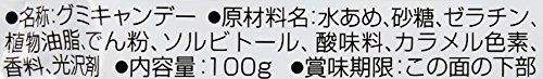 원재료:물엿,설탕,젤라틴,식물성 기름지,나오지 않겠 분,솔《비토루》,신맛료,카라멜 색소,향료,광택 제