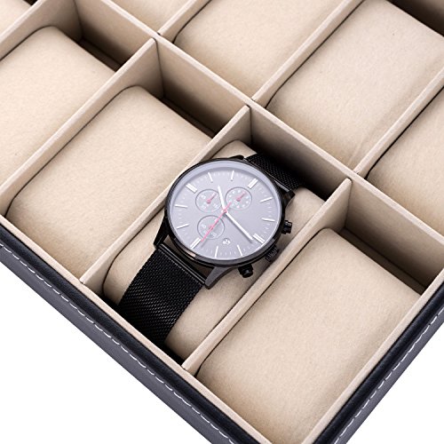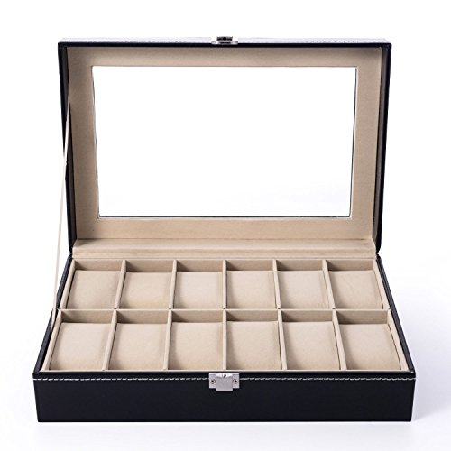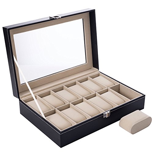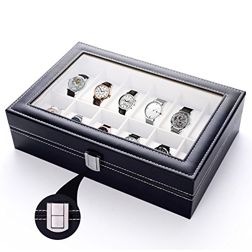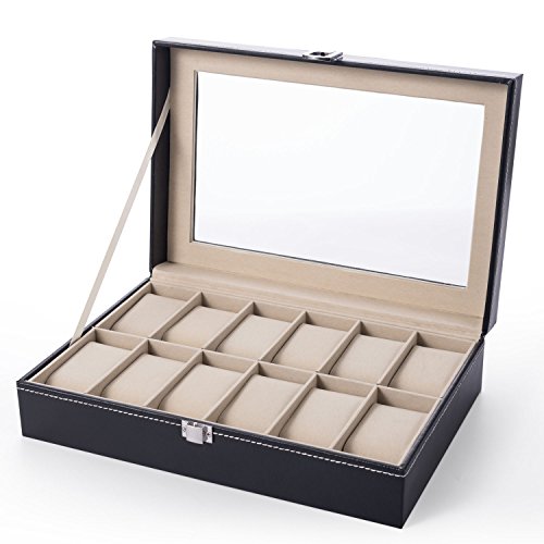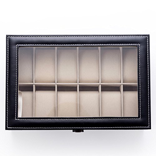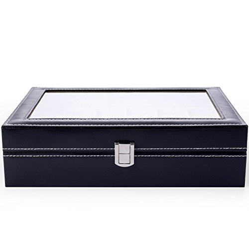LONGBLE Mens Large Watch Box Black Pu Leather Display Glass Top Jewelry Case 12 Slots Organizer Box …