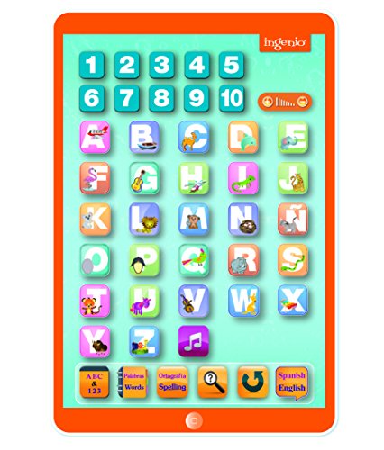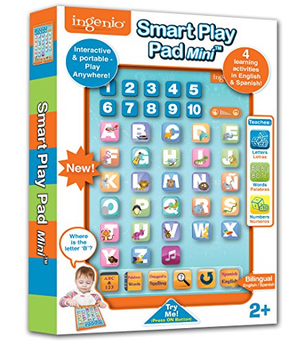 Make early learning fun & exciting with the brand new electronic portable Mini Play Pad. Perfectly sized for little hands to carry, play & explore. Has all the features and capabilities of our larger Smart Play pad. Your little ones will love the cool looking tablet that's easy to use and can play anywhere. More than 30 touch sensor keys teach language and pronunciation skills to help prepare your child for kindergarten. Four game modes are full of fun ways to discover letters, phonics, numbers, sounds and more. Bonus - Bilingual feature helps kids learn the alphabet and numbers in English and Spanish.Feature