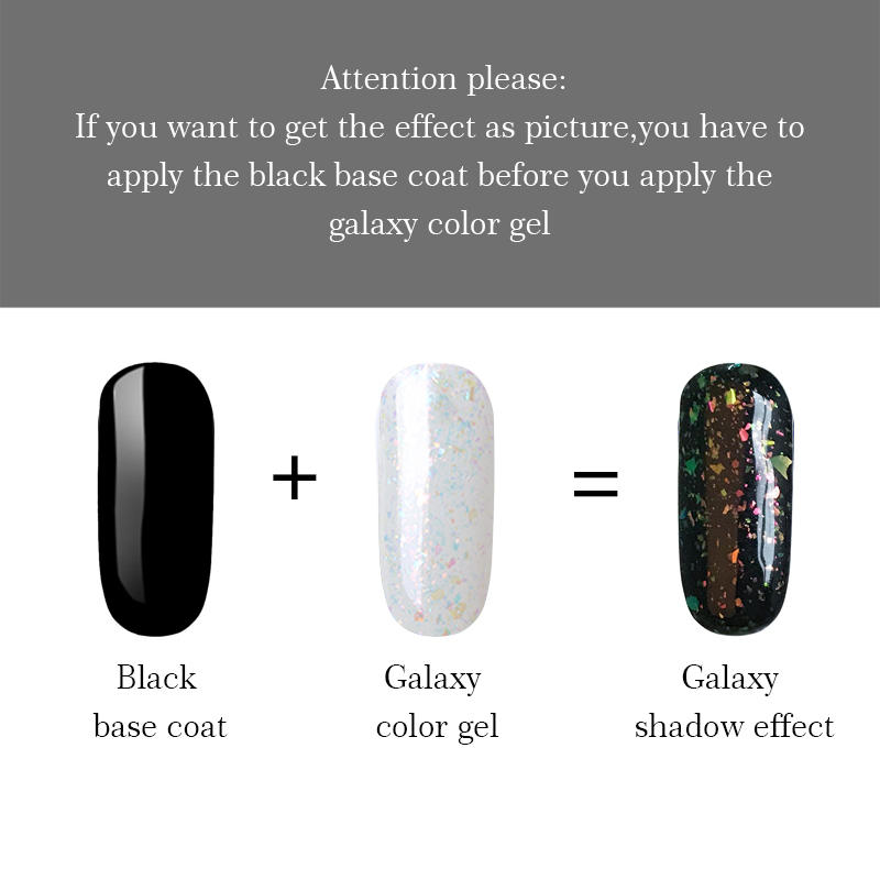 Attention Please:If you want to get the effect as picture show,you need to apply the black base coatu0026nbsp; before you applyu0026nbsp; the galaxy color gel