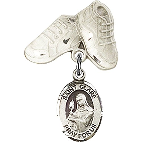 -. Title : Sterling Silver Baby Badge with St. Clare of Assisi Charm and Baby Boots Pin 1 X 5/8 inches