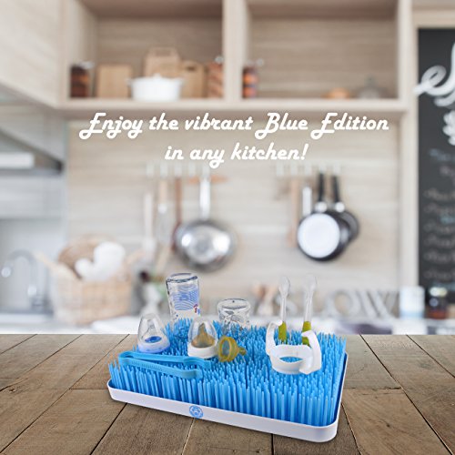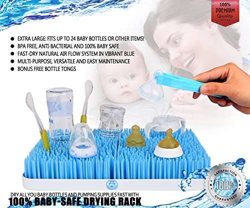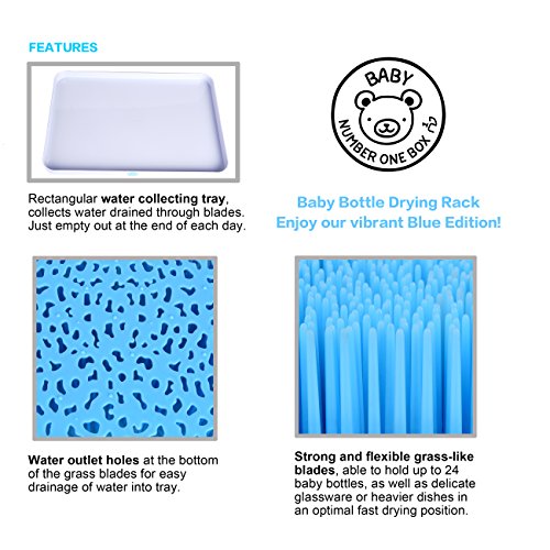 -. Feature : EXTRA LARGE, HOLDS ALL BABY BOTTLES and ACCESSORIES. Dry all your baby bottles and feeding accessory at the same time with this high capacity, fast dry rack. This kids dish dryer stand holds up to 24 bottles at once, so you can fit everything at once and be ready for the next meal. It can be used for toddler or breastfeeding gear, including valves, nipples, straws, sippy cups, spoons, pacifiers, breast pump parts and more. Very large 15.6x10.5x2.6 inches holds everything for one or many babies. / NATURAL, FAST DRY DESIGN. Expertly designed Fast Dry Natural Air Flow System helps every busy mom save time by having your baby bottles and pump parts ready fast. Crafted to look great in any home, the vibrant blue, not the usual green, matches all kitchen styles. With its extra large rectangle shape and 3 piece design for easy assembly, this is the BEST baby bottle draining mat and organization system out today. Made by NUMBER ONE BOX, your trusted source for all safe baby accessories. / SAFE FOR CHILDREN, WITH NO BPA and ANTI BACTERIAL. Tried and Tested Baby Safe. The bottle dryer has no BPA, Pthalate or PVC, and the antibacterial design stops mould from forming. The plastic tray keeps your counter dry by collecting excess water, while the dividers keep bottles in place for quick drying. Simply pull out and empty the tray to clear the excess water in seconds. The included bonus PLASTIC BOTTLE and NIPPLE TONG helps you move sterilized items safely and easily. / PERFECT BABY SHOWER PRESENT. The perfect item for any expecting mother, our rack appears on nearly every moms Must Have baby item list. Saving mothers time with the fast drying system and keeping babies healthy with the NO BPA design, you cant go wrong giving this as a present. Packaged in a lovely box with instructions on care and cleaning, this rack makes your baby shower present a welcomed and practical addition to the kitchen for any mother.