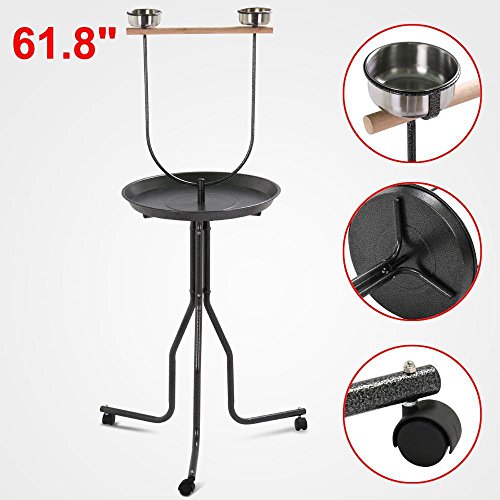 Features: 3 Wheels for easy transportation Suitable for small or medium sized pet birds Designed with 3 wheeled legs for more stability 2 Stainless steel bowls and tray for water and food 55 cm/21.7' High tray keeps your house from being in a mess Sturdy wooden stick for your parrot to stand with great comfort Solid metal construction with stainless steel bowls and wooden stick