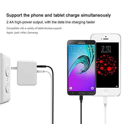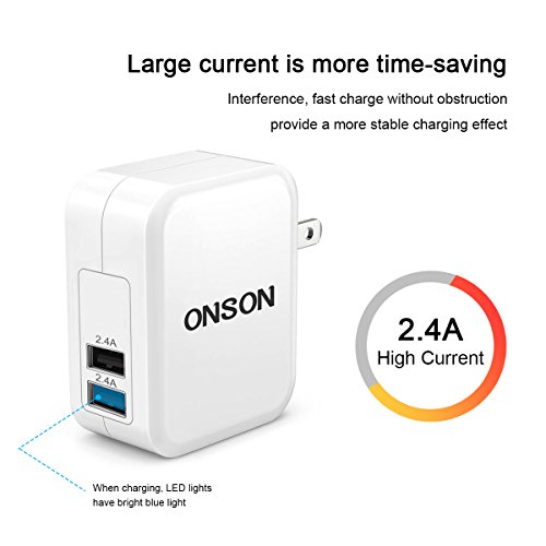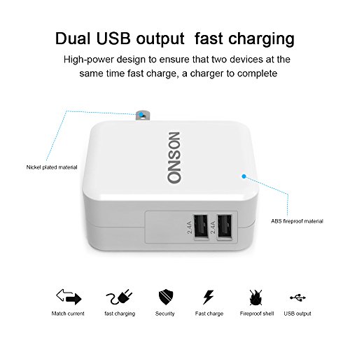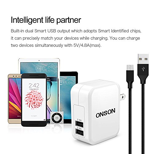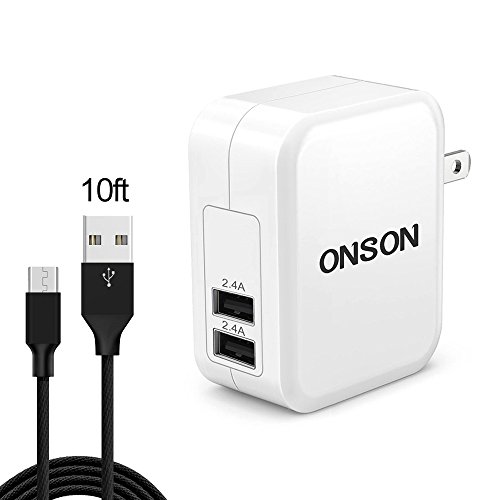 ONSON USB Charger,4.8A 24W Dual USB Portable Travel Wall Charger Adapter with Foldable Plug + 10FT Extra Long Mirco USB Cable Android Charging Cord for Samsung Galaxy S7 Edge/S6 Edge/S5/S4/HTC