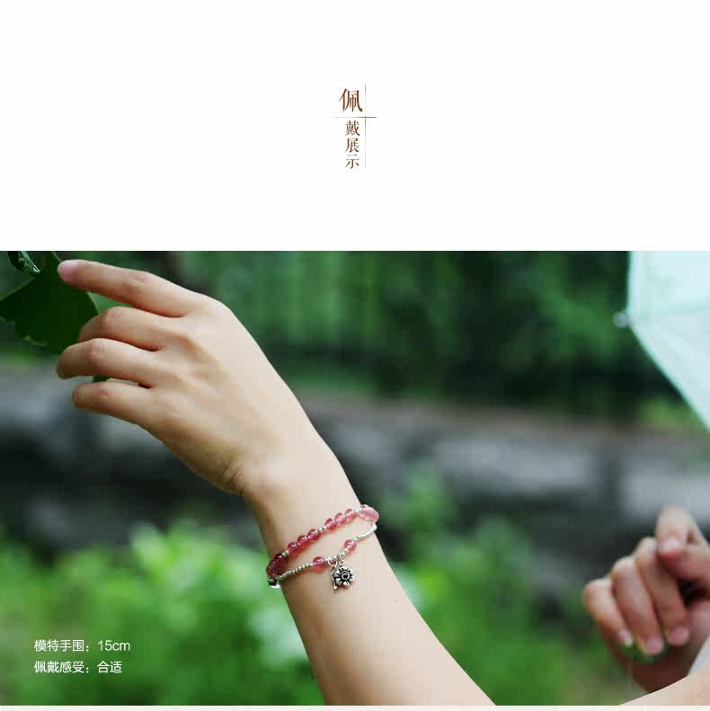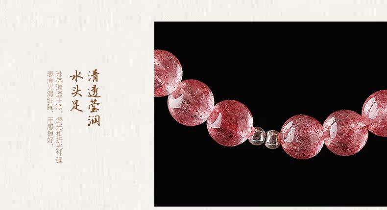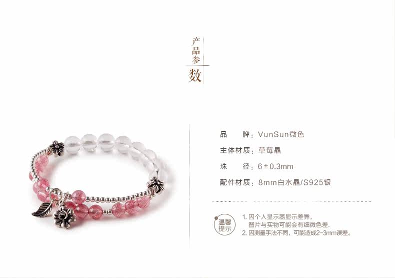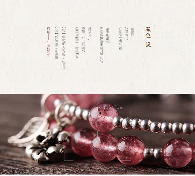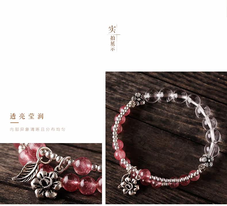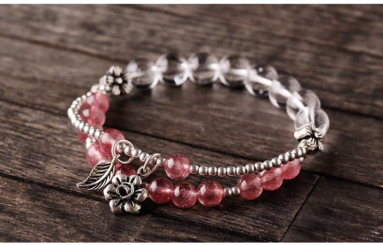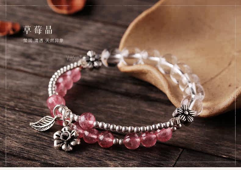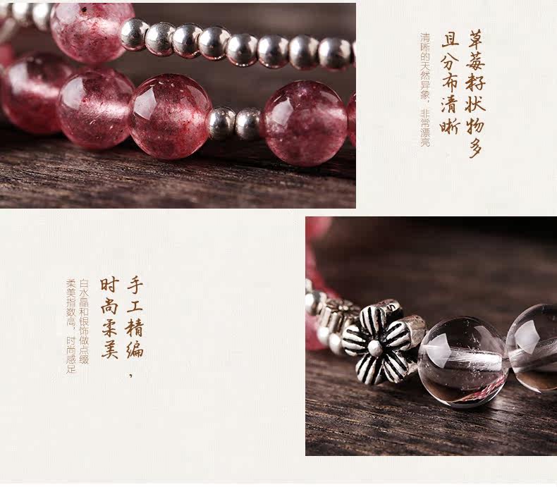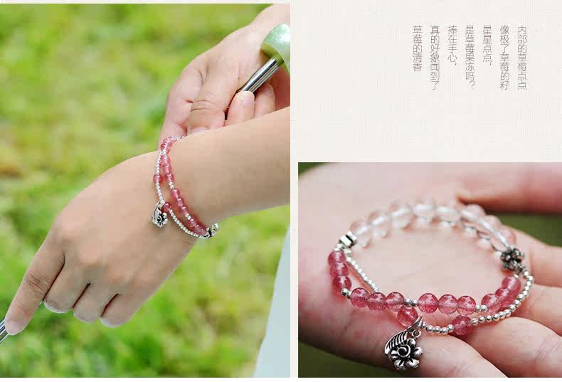 天然草莓晶手链女款 多圈粉色白色水晶手串925银 甜美饰品