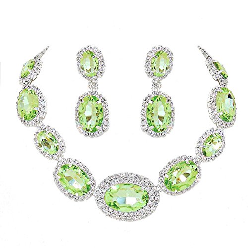 -. Binding : Jewelry -. Brand : Unknown -. Department : womens -. Feature : 15 inch long extra large scaled and chunky light green and clear rhinestone oval shaped station statement necklace. / Necklace measures 15 inches in length with an additional 4 inches of wearable length available via extender chain. / Necklace has 3 sizes of stations: 1 5/8 inch by 1 ¼ inch; 1 ¼ inch by 1 inch; and 7/8 inch by ¾ inch. / Exta large and chunky matching dangle drop earrings measure 2 ½ inches in length and 1 inch at the widest points. / All prong-set rhinestones in silver-tone. -. Label : Unknown -. Manufacturer : Unknown -. Model : EVN17114SGR -. MPN : EVN17114SGR -. PartNumber : EVN17114SGR -. ProductGroup : Jewelry -. ProductTypeName : FASHIONOTHER -. Publisher : Unknown -. Studio : Unknown -. Title : Chunky Victorian Look Pale Green & Clear Rhinestone Oval Station Statement Necklace 15” w/ Earrings