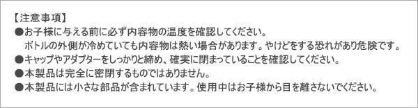 | 仕様 | 対象年齢:6ヵ月頃~ 容量:180ml 食器洗い乾燥機使用可能 電子レンジ使用不可 消毒:煮沸可能(※5分まで)、薬液可能 【耐熱温度】 ボトル・バルブ:140℃ キャップ・吸い口・アダプター:100℃ |