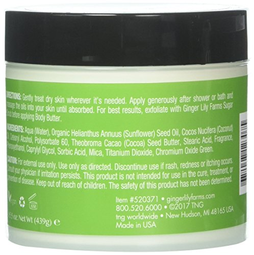 Ginger Lily Farms Botanicals Body Butter is 92% natural and made with Organic sunflower seed oil, coconut oil, cocoa butter and essential oils. Hydrates, softens and heals the skin. Perfect for full body, hand and foot massages. Deep penetrating results last up to 24 hours. Net weight 15.5 oz.Feature