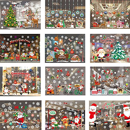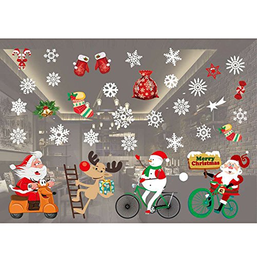 Christmas Windows Stickers, White Snowflakes Santa Claus Snowman Elk Removable Wall Art Decals for Xmas Ornaments Winter Decoration Or Home Decor (A)