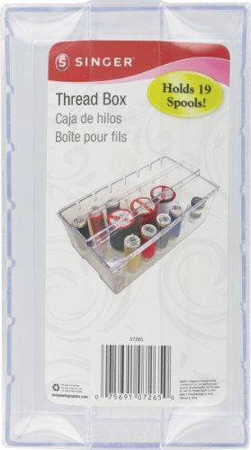 -. Feature : The singer thread box is made of sturdy clear plastic and holds 19 spools of thread / The thread box holds both regular and thin spools of thread / Each spool is held neatly on its own post for easy organization