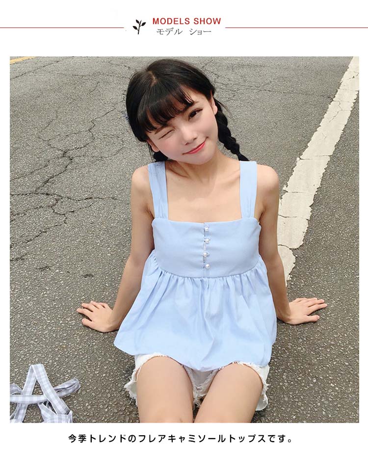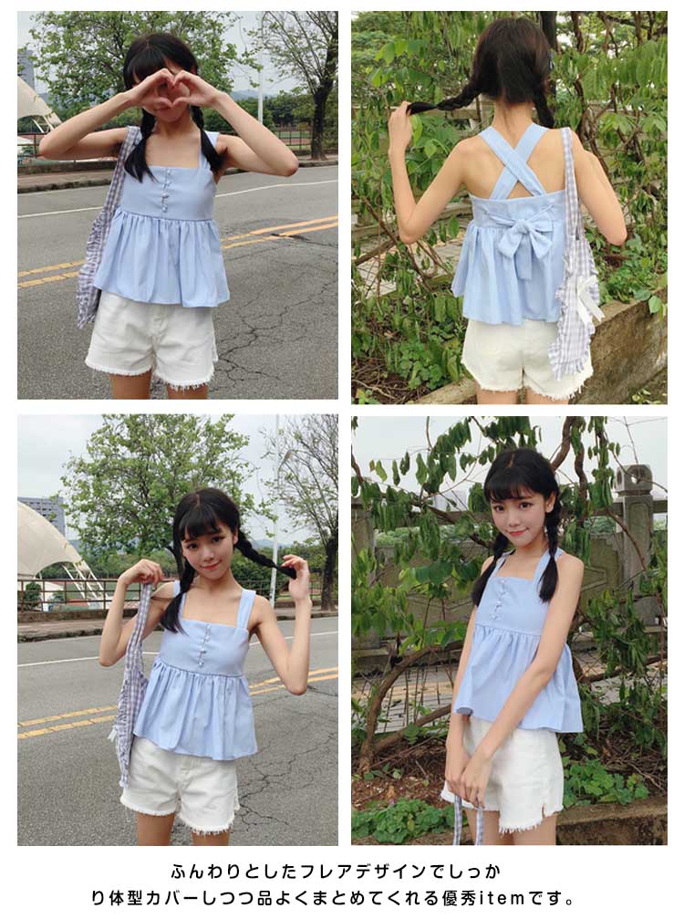| バッククロスリボンがかわいい。今季トレンドのフレアキャミソールトップスです。ふんわりとしたフレアデザインでしっかり体型カバーしつつ品よくまとめてくれる優秀itemです。程度よく肌露出で季節感も簡単に演出してくれます。ショートパンツなどのボトムスと合わせるだけでおしゃれコーデ完成! | |