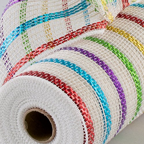 - A 10 yard roll of woven poly mesh with white cotton threads running down the mesh for added texture. Brightly colored foil stripes in a range of primary colors runs down the mesh too. Stripes are red, turquoise blue, purple, green and gold. This style of blended cotton and poly deco mesh is a durable synthetic mesh weave that measures 10.5" wide by 10 yards or 30 feet long. Available in additional widths and colors.