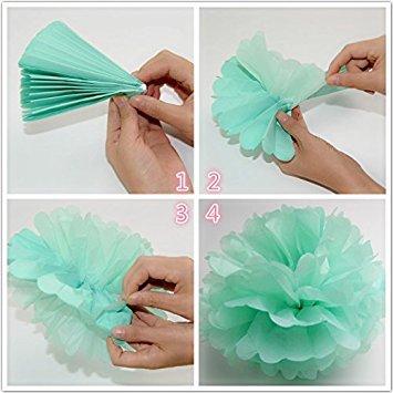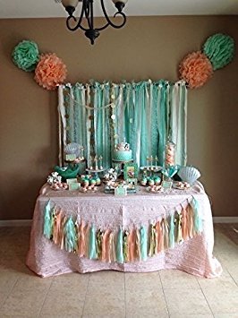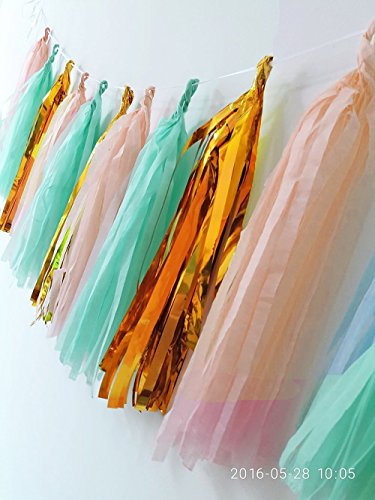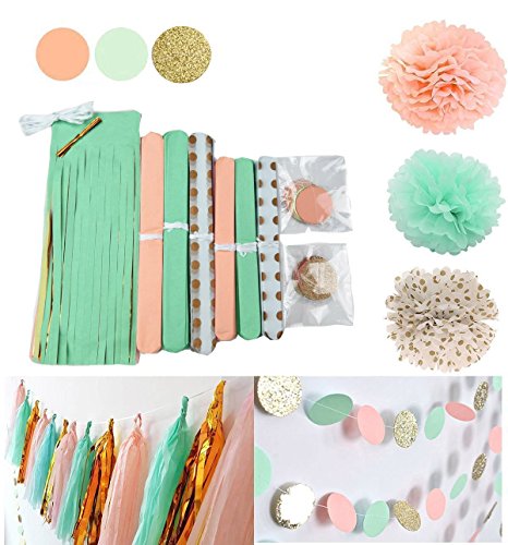 Mint Bridal Shower Package include:6 pcs tissue paper flowers:2 pcs peach(1 12inch+1*10inch)+2 pcs mint(1 12inch+1*10inch)+2 pcs Gold Polka Dot Tissue Paper Pom Poms 12inch+1*10inch); 1 pack of peach mint gold mixed color paper tassel with one white ribbon and using instruction,totally 12 sheets,each color comes with 4 pcs. 2pcs peach glitter gold mint mixed color of polka dot garland. Paper Garland Length: approximately 6.5 feet.