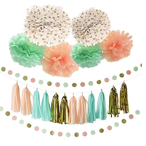 Qian's Party Mint Peach Glitter Gold Tissue Paper Pom Pom Gold Tissue Pom Pom Paper Tassel Polka Dot Paper Garland for Baby Shower Decorations Wedding Nursery Bridal Shower Decorations
