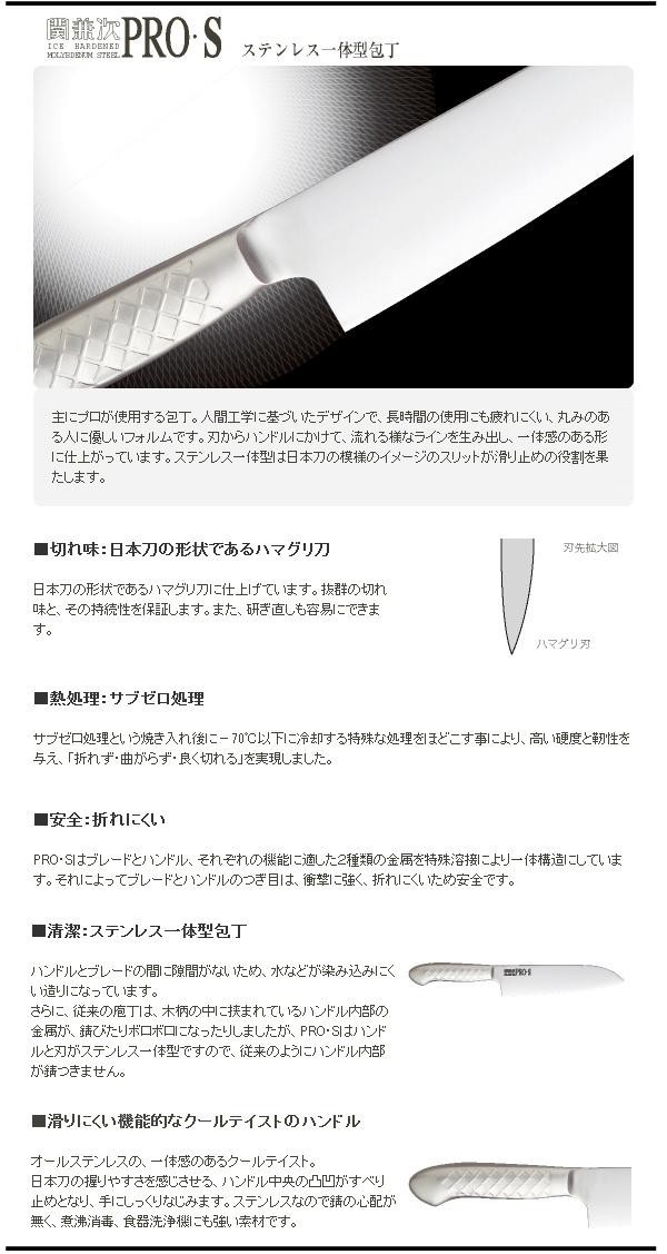 PRO・Sシリーズの牛刀は、家庭からプロまで広く愛用される包丁です。人間工学に基づいたデザインで、長時間の使用にも疲れにくい、丸みのある人に優しいフォルムが特徴。刃からハンドルにかけて、流れるようなラインを生み出し、一体感のある形に仕上がっています。ステンレス一体型は、日本刀の模様のイメージのスリットが滑り止めの役割を果たします。 |