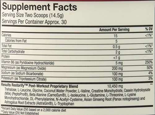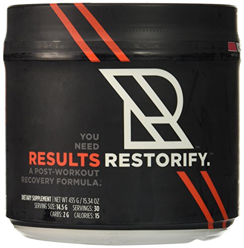 ReleaseDate : 2015-12-12 Studio : Results Nutrition Publisher : Results Nutrition Binding : Health and Beauty Product Description Its time to set your goals and find some products that will help you achieve them. Get the results you need with restorify eaa post-workout in fruit punch. A clinical strength post-workout fuel that will charge your body while helping you build more muscle! Clinical strength post workout fuel ensures better muscle development and recovery. What's in the label is inside every serving of Results Nutrition products. 0