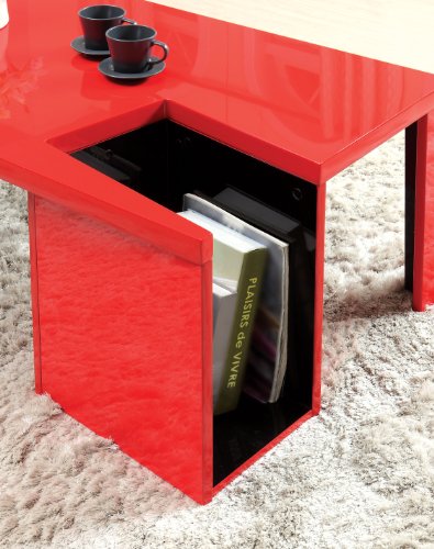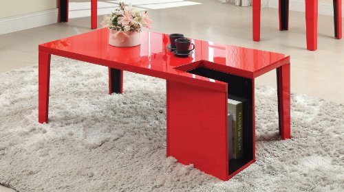 - Feature : Three (3) two-tone designs: Black exterior with white interior, Red exterior with black interior, White exterior with black interior / Two-tone coffee table with built-in magazine rack on side / High gloss lacquer coating offers shining visual; Striking modern appearance / Magazine rack easily stores books and oversized accessories; Tapering legs sturdily support expansive design / Overall dimensions: 47.5"W x 26"D x 18"H