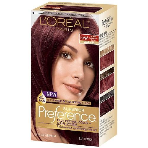 -. Binding : Health and Beauty -. Color : Brown -. Feature : Long-Lasting Color With Superior Shine / Fade Resistant Conditioning Colorant / New Shine Extending Formula / No-mess Color Gel -. Label : AB -. Manufacturer : AB -. PackageQuantity : 1 -. ProductGroup : Beauty -. ProductTypeName : HEALTH_PERSONAL_CARE -. Publisher : AB -. Studio : AB -. Title : L'Oreal Superior Preference Fade Defying Color & Shine System, Permanent, Medium Mahogany Brown 5MM 1 ea