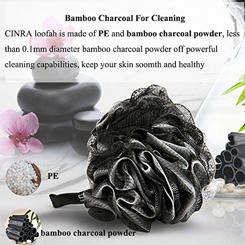 - LOVELY GIFT - CINRA 4 pack of lufa sponge shower loofah ball comes in black color which is made of Polyethylene (PE) and Bamboo charcoal, bath sponge is soft and comfortable,which is the best choice for you to shop as a present for your kids,lover.The Perfect Loufa Sponge Gift Set For Him or Her. Every Morning will Feel Like a Trip to the Spa