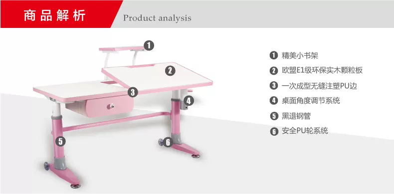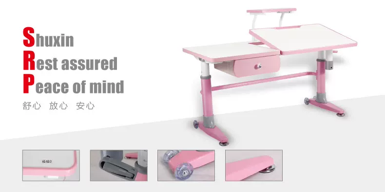 Main desk top can be tilted easily by the handle. Desk and chair are adjusted easily by ROTATING shaft handle clockwise or anticlockwise. There are reference card for the height of the desk. Desk top can be tilted. 7 degree is for writing, 45 degree is for reading and painting Desk's legs with wheels easy to move desk. Hook for hang bags.