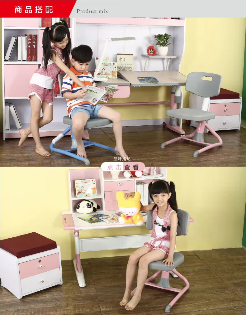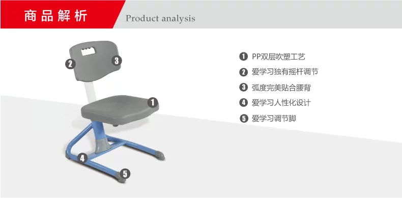 Desk top is made of E1 MDF board + Melamine face + injection PU seamless edge. The thickness of desk top is 25mm. The seat/back board is made of two layer blown PP(which is green/ environmental protection material), the seat boards' ventilate ability is very well. Frame is made of steel tube. The both of desk's and chair's height can be adjusted, besides, the desk top can be inclined.