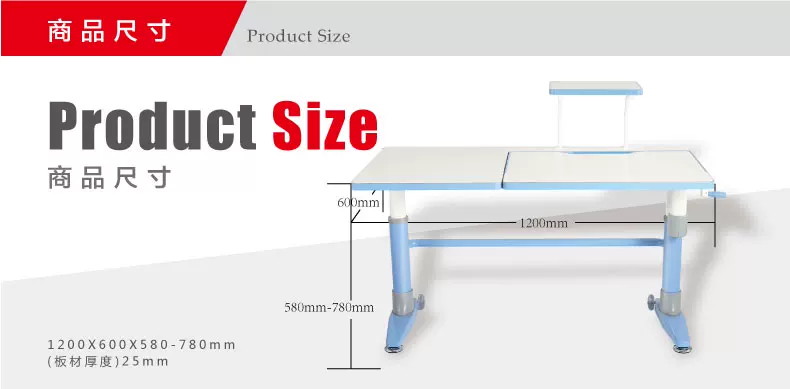 Desk:1200*600*580-780mm Chair:390*400*360-460mm Both desk and chair height can be ajusted.