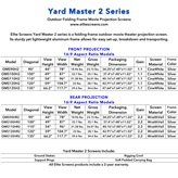 Elite Screens Yard Master 2 series is an excellent addition for your next outdoor event. Designed with ease of use in mind, this impactful presentation piece will quickly set up without the use of any tools. The ingenious, single-piece frame system is made of sturdy yet lightweight aluminum that can withstand the rigors of regular use and windy conditions with the included support system. The Yard Master 2 features black masking borders that enhance picture contrast and quality, and incorporates a snap-button setup that provides a tensioned and flat projection surface. This outdoor projection screen package includes the multi-piece frame, screen material, a carrying bag, ground stakes, rigging cords, and support rings. A multitude of sizes, and front or rear projection configurations are available to meet your needs.