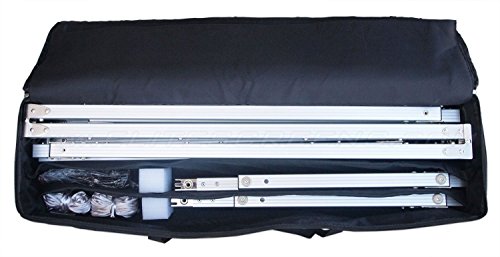 Assembles in minutes without the use of tools! Lightweight aluminum square tube construction easily transports with included padded carrying bag. Screen is mildly weather resistant, but should not be left exposed to the elements for extended periods of time. For maximum longevity, disassemble screen and store away indoors.