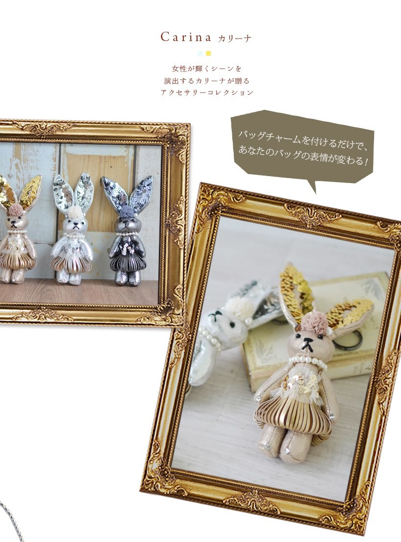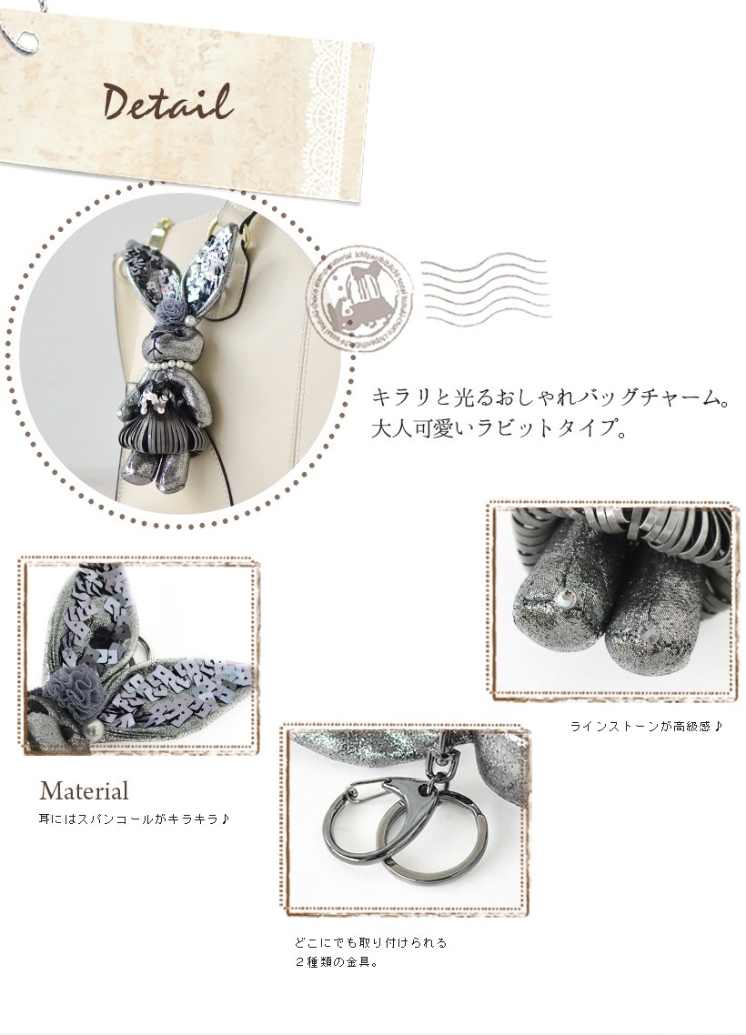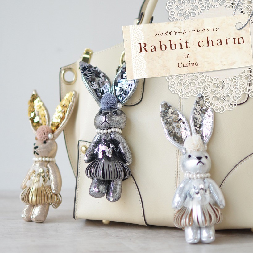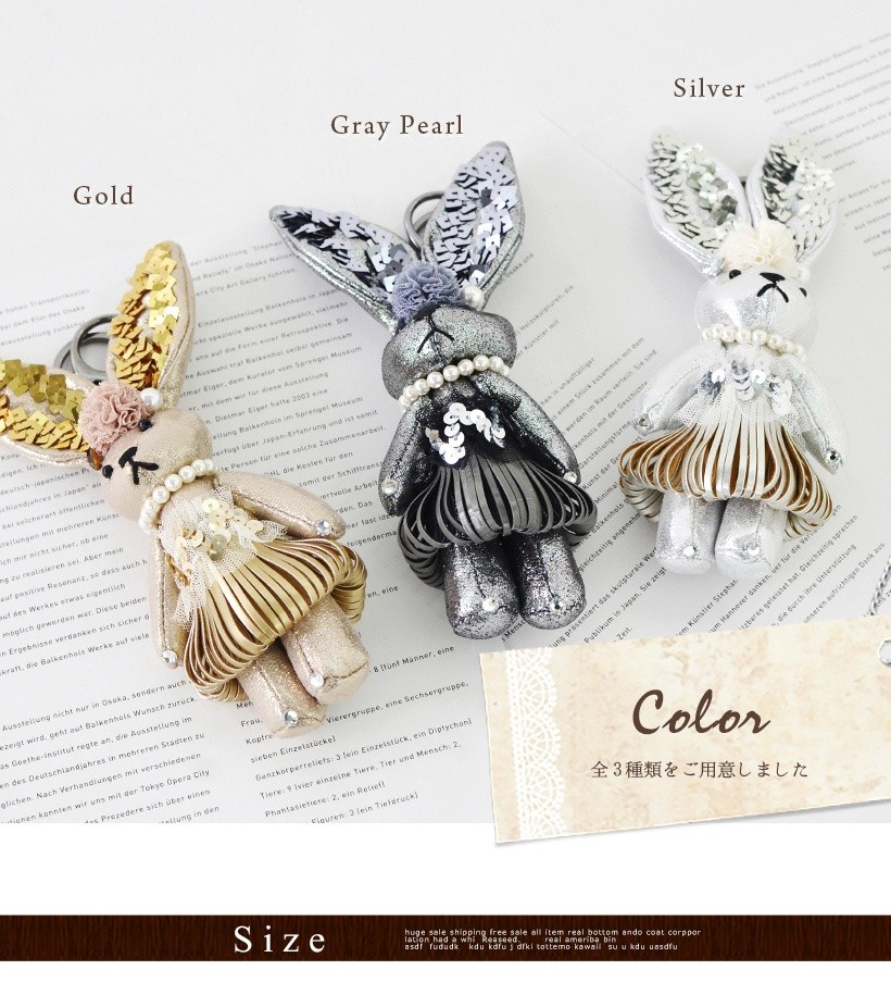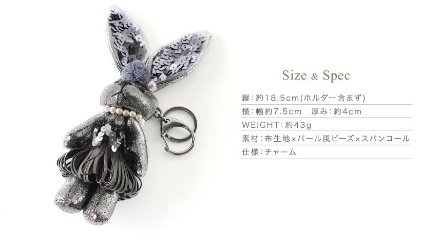 キラキラしたパーツで着飾ったオシャレなウサギチャーム インパクトのある大きいサイズでメタリックカラーがポイント。大きな耳のスパンコールがキラキラしてきれいです。●SIZE:縦:約18.5cm(ホルダー含まず) 横:幅約7.5cm 厚み:約4cm●重さ:約43g●素材:布生地×パール風ビーズ×スパンコール●仕様:チャーム●カラー:シルバー・ゴールド・グレーパール