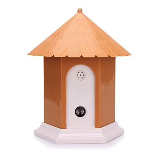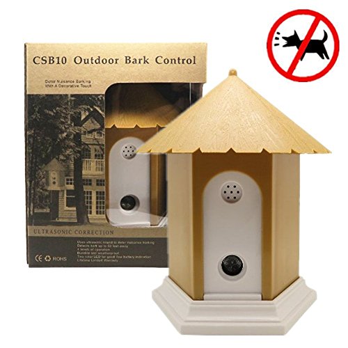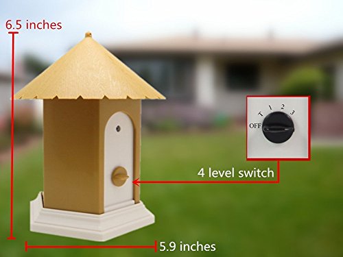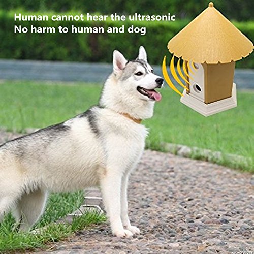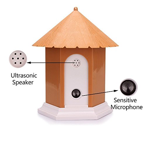 Specifications: Material: PP Power: 1 * 9V Battery (Battery is not included) LED Color: Green / Red Modes: T: Verify the microphone and speaker are functional 1: Low range(Up to 15 feet) 2: Medium range(Up to 30 feet) 3: High range(Up to 50 feet) Item Size: Approx. 15.5 * 15.5 * 16.5cm / 6.1 * 6.1 * 6.5in (L * W * H) How does it work? Insert a standard 9-volt battery into the Ultrasonic Dog Bark Controller in Birdhouse Shape. The unit is automatically activated by the sound of barking. When the device is within the range of a barking dog, the microphone will isolate and pick up the barking to emit an ultrasonic sound to silence the dog. The anti-bark device has three range levels, including a test mode, and is effective up to 50 feet. Note: This product is only suitable for outdoor use. Don't touch by children. The product will not work on deaf or hearing impaired dogs. Human cannot hear the ultrasonic sound, however precautions should be taken when preparing the outdoor bark control for use. What's included: Ultrasonic Dog Bark Controller in Birdhouse Shape (battery not included) and user-friendly manual