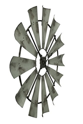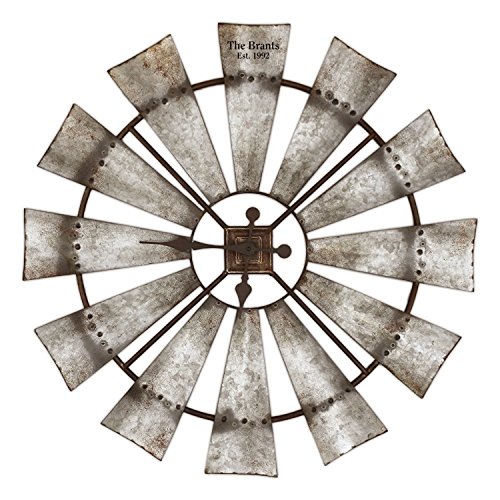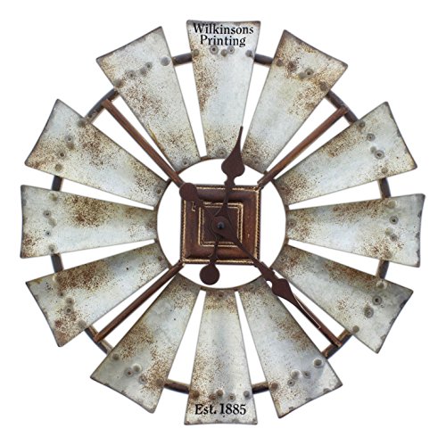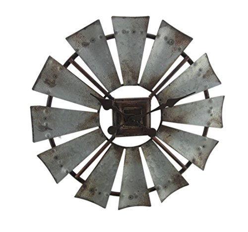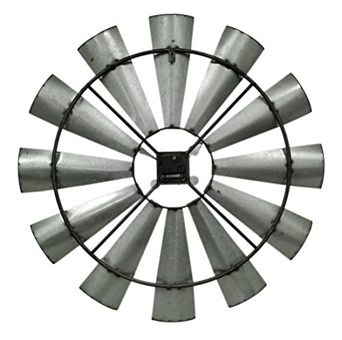 Decorate your home with this large, rustic style wall clock. The unique windmill design features twelve blades which correspond to each hour. Galvanized metal blades and rusted accents create a vintage look. The clock measures 30" in diameter and includes a built-in nail hanger. Requires 1 AA battery, not included.Feature