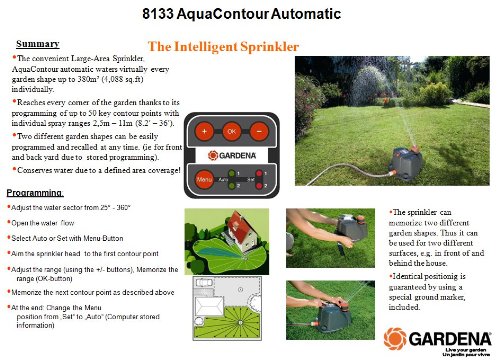 -. Binding : Lawn & Patio -. Brand : Gardena -. EAN : 0066283081334 -. Feature : The convenient solution for individual irrigation of every garden shape. / Two different garden shapes, e.g. in front of and behind the house can be programmed and recalled up again at any time. / Dirt-resistant membrane keyboard with clear operator guidance for simple programming. / With soft plastic nozzles for even water distribution. / With two ground markers for precise positioning in programmed irrigation areas. -. Label : Gardena -. Manufacturer : Gardena -. Model : 8133-U -. MPN : 8133-U -. PartNumber : 8133-U -. ProductGroup : Lawn & Patio -. ProductTypeName : OUTDOOR_LIVING -. Publisher : Gardena -. Studio : Gardena -. Title : Gardena 8133 Aquacontour Automatic Fully Adjustable Large Area SP.R.Inkler -. UPC : 066283081334