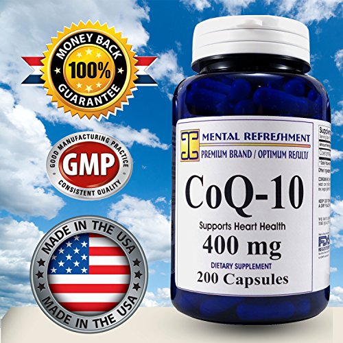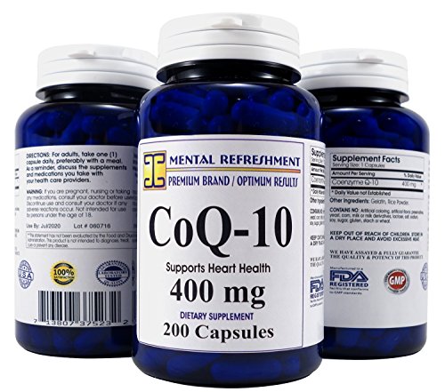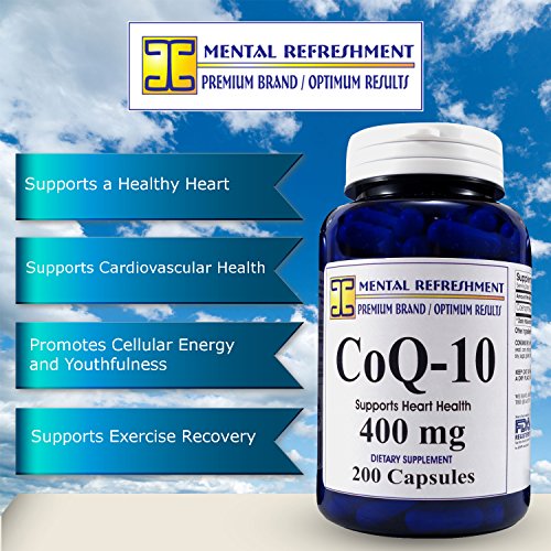 -. Feature : HEART VITALITY, CARDIOVASCULAR HEALTH, & CELLULAR ENERGY: CoQ10 helps maintain a strong and healthy heart, increase energy levels making you feel more alert and strong. It supports cellular energy and keeps your heart tissues from degrading* / BEST VALUE ON AMAZON - 200 CAPSULES - 400MG each - Over 6 month supply. One bottle of our product contains 200 capsules of extra strength CoQ10 providing you with 200 days of our product. Our competitors offer significantly less capsules at lower concentrations. With our Mental Refreshment Brand of Co Q-10 you buy fewer bottles saving you money and time.* / MAXIMUM STRENGTH 400MG PER CAPSULE - Our most popular supplement delivers 400 mg of 100% pure coenzyme Q10 (CoQ10) per daily serving. Our high absorption CoQ 10 formula is naturally sourced and contains 400mg per serving.* / 100% SATISFACTION GUARANTEED - ORDER RISK FREE: If within 30 days your unhappy with your product in any way just send it back to us and we will fully refund your purchase P.R.Ice. No questions asked. * / HIGHEST QUALITY AVAILABLE: our product is made from pure CoQ10 free of extraneous fillers, binders and artificial ingredients to ensure no unwanted side effects for you! All of our supplements pass through extensive quality control testing before being bottled and sold. We use only FDA registered and GMP compliant manufacturing facilities in the USA. You can rest assured that you are receiving a high-quality product each time you buy from Mental Refreshment Nutrition.*