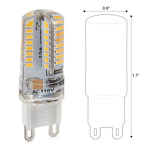 Specifications: Material: PCB Ceramic PC Bulb Base: G9 Type: LED Bi-pin Lights Certification: CE RoHS LED Type: SMD 3014 Voltage: AC110-130V Wattage: 3W LED Quantity: 64 Working Temperature: -20~ 45 °C Light Color: Warm White Initial Lumens: 250lm CRI: > 80 Color Temperature: 3200K Lifetime: >30,000hrs Dimension: 5CM*1.6CM*1.6CM Weight: 8.4g / piece