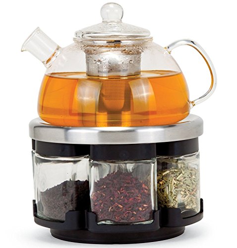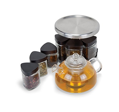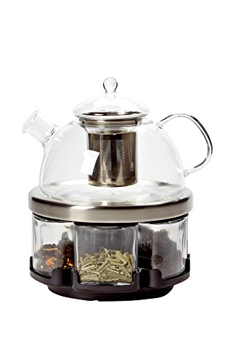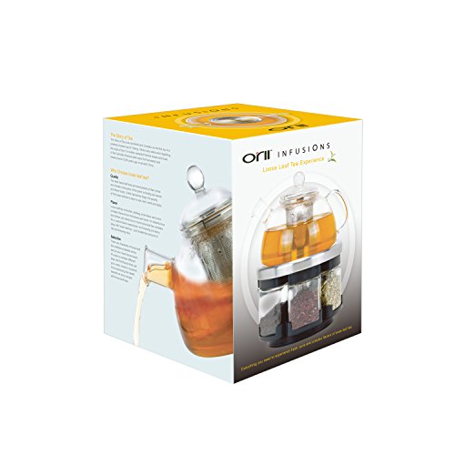 Studio : Orii Publisher : Orii Binding : Kitchen Product Description Orii Infusions 6 1 glass tea rack set. High temperature resistant, Borosilicate glass kettle. Stainless Steel base stainless steel Infuser. 6 Airtight glass tea canisters include the following tea samples in 2oz packets: Jasmine Green Tea, Chai Tea, Gun Powder, Early Grey, Hibiscus Tea, Lemon Grass Tea. Kettle capacity 24.7oz. Hand wash kettle with warm and soapy water, air dry. 0