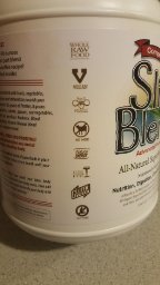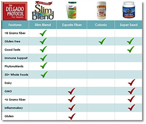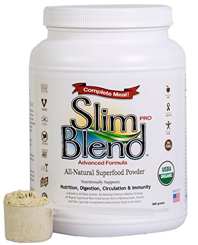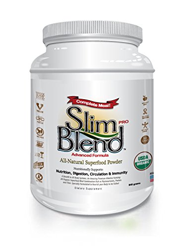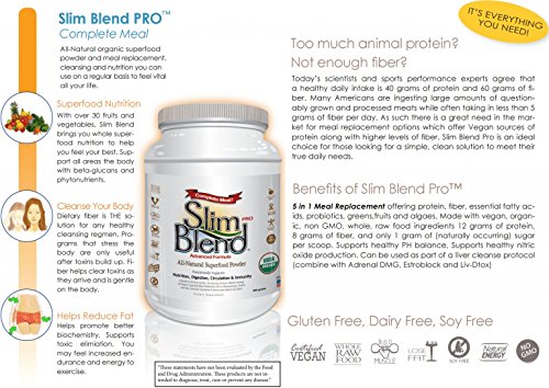 Benefits of Slim Blend Pro 5 in 1 Meal Replacement offering protein, fiber, essential fatty acids, probiotics, greens/fruit/algae blend Made with Vegan, Organic, Non GMO Whole Raw Food Ingredients Gluten Free, Dairy Free, Cholesterol Free, Soy Free 12 grams of protein, 8 grams of fiber, and only 1 gram of sugar per scoop Supports healthy acid-alkaline balance Supports healthy nitric oxide production (master neurotransmitter) Too much animal protein, not enough fiber? Today's scientists and sports performance experts agree that daily intakes of protein and fiber should be 40 grams of protein and 30 grams of fiber. Many Americans are ingesting large amounts of questionably grown and processed meats while often taking in less than 5 grams of fiber per day. As such there is a great need in the market for meal replacement options which offer Vegan sources of protein along with higher levels of fiber. Slim Blend Pro is an ideal choice for those looking for a simple, clean solution to meet their true daily needs.Feature