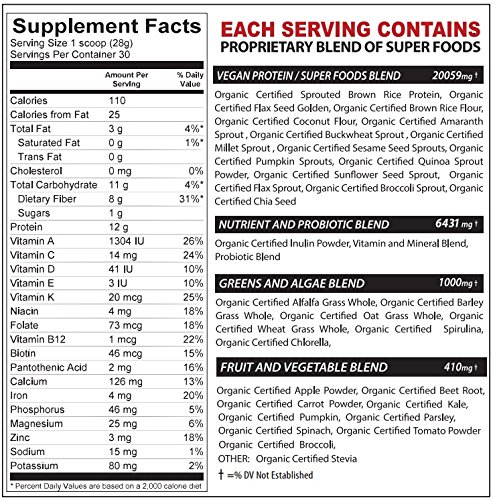 ONLY TOP QUALITY INGREDIENTS - 50+ Organic Superfoods, 8g Fiber, 1g Sugar only, 110 kcal per Serving, 30 Servings per container