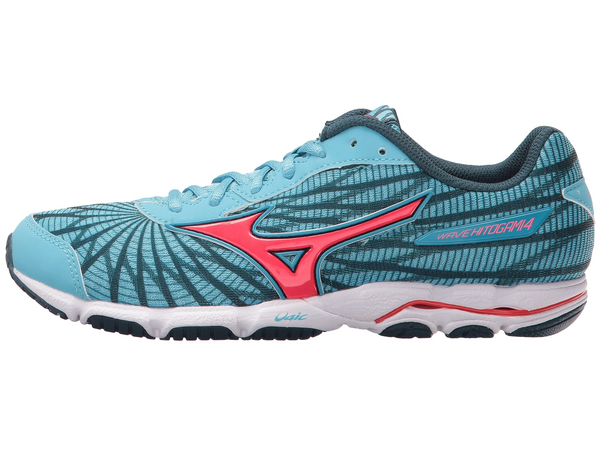 | Product Information SKU: #8803308Meet your daily mileage quota in the lightweight cushioning of the Mizuno? Wave Hitogami 4 running shoe!Predecessor: Wave Hitogami 3. Support Type: Neutral to underpronation (supination).Cushioning: Lightweight, flexible response. Surface: Road.Differential: 9 mm.Updated mesh upper supplies increased breathability.Synthetic leather overlays. Improved DynamotionFit moves with the foot for a secure, flexible fit.Lace-up closure. Plush tongue and collar. Soft fabric lining for a great in-shoe feel. Removable foam insole.Softer U4icX strobel lasting board.Mizuno Intercool delivers full-length ventilation that reduces heat and humidity in the shoe.Innovative U4ic midsole gets an overhaul that makes it more responsive and highly durable.Parallel Waver? in the heel provides progressive, tunable support, lightweight response, and helps disperse impacting forces.X10™ carbon rubber outsole promotes long-lasting wear.SmoothRide Engineering™ offers a unique sole design to create a smooth, rocking-chair-like transition from heel to toe.Imported. Product measurements were taken using size 7.5, width B - Medium. Please note that measurements may vary by size.Weight of footwear is based on a single item, not a pair.Measurements: Weight: 6 oz |