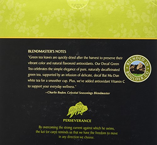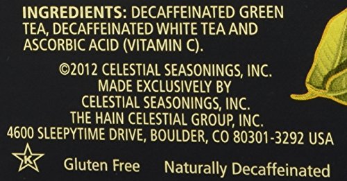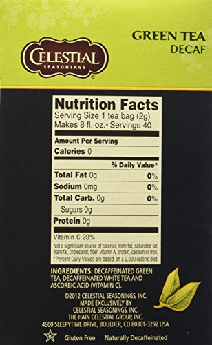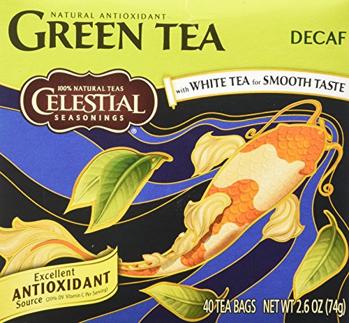 -. Binding : Grocery -. Brand : Celestial Seasonings -. Color : A865 -. EAN : 0798527080345 -. Feature : Disclaimer: This website is for informational purposes only. Always check the actual product label in your possession for the most accurate ingredient information due to product changes or upgrades that may not yet be reflected on our web site. These statements made in this website have not been evaluated by the Food and Drug Administration. The products offered are not intended to diagnose, treat -. Label : Celestial Seasonings -. LegalDisclaimer : Information about this product is provided for informational purposes and is not meant to substitute for the advice provided by your own physician or other medical professional. You should not use the information contained herein for diagnosing or treating a health problem or disease, or prescribing any medication. You should read carefully all product packaging. If you have or suspect that you have a medical problem, promptly contact your health care provider. Information and statements regarding dietary supplements have not been evaluated by the Food and Drug Administration and are not intended to diagnose, treat, cure, or prevent any disease. All discounts are taken from sested retail prices. -. Manufacturer : Celestial Seasonings -. Model : 070734005152 -. MPN : 070734005152 -. NumberOfItems : 1 -. PackageQuantity : 1 -. PartNumber : 070734005152 -. ProductGroup : Grocery -. ProductTypeName : GROCERY -. Publisher : Celestial Seasonings -. Size : 40 -. Studio : Celestial Seasonings -. Title : Celestial Seasonings Decaf Green Tea Bags - 40 ct -. UPC : 798527080345