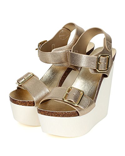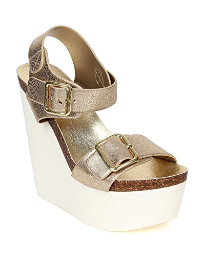 - Title : Soda CE37 Women Metallic Open Toe Buckle Platform Wedge Sandal - Light Gold (Size: 8.0)