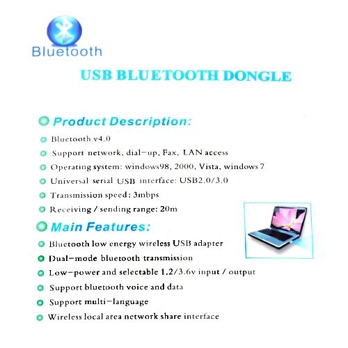 -. Feature : Bluetooth V4.0 + HS, Class 2 level, USB V2.0 / Ultra-low power consumption/dual-mode Bluetooth / Maximum asynchronous transfer rate of 24Mbps / 2.4Ghz~2.4825Ghz ISM band / Ultra portable - tiny enough to stay with your laptop