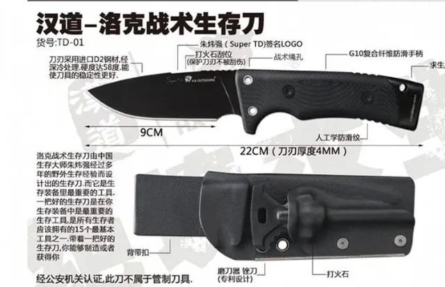 상품 내용 전체 길이: 22 센치메터 블레이드 길이: 9 센치메터 핸들 길이: 13 센치메터 블레이드 두께: 0.4 센치메터 블레이드 재질: D2 핸들 재질: G10 표면: 블랙 경도: 59-61HRC 무게: 350 그램 다른: K 칼집 + 선물 상자 제품 사진