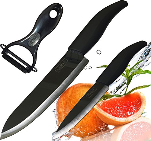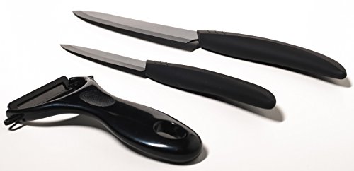 Ceramic Kitchen Knife Set Includes 4" Paring Knife, 6" Chef Knife and Fruit/Vegetable Peeler.