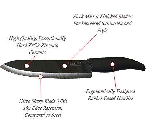 Gourmet Chef Ceramic Kitchen Knives - Professional 3-Piece Ceramic Kitchen Knife Set With Utility Knife, Paring Knife and Fruit Peeler, Black Mirror Finish Blade