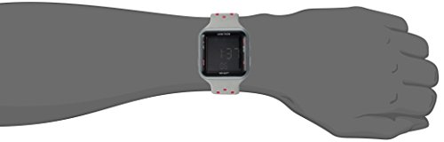 Grey square shaped case with glass crystal lens; reverse LCD display with time, seconds, day and date; grey and pink double injected silicone strap with buckle closure