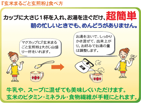 ○【お召し上がり方】:マグカップに『玄米まるごと玄煎粉』大さじ一杯を入れ、お湯を注いでかき回せば出来上がり。