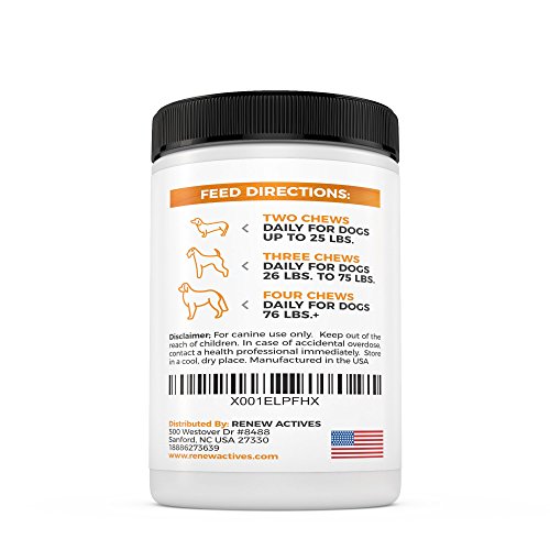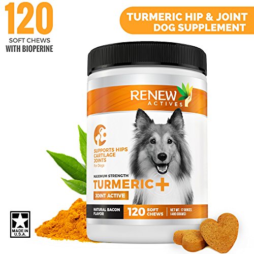 -. Feature : ADVANCED TURMERIC SUPPLEMENT: Renew Actives organic, gluten free tumeric formula helps pets increase their mobility, relieve joint pains and aches, and cushion hips in a healthy and chemical free chew / TOTAL PET MOBILITY: Keep your animal active with ingredients like glucosamine to help arthritis and joint structure, MSM to assist with pain relief and chondroitin to promote hip and ligament wellness / SAFE AND EFFECTIVE: Take care of your puppy or dog with natural soft chews that do not use gluten, dairy, corn, sugar, wheat, soy, salt or gumming agents for a pure, powerful canine performance boost / FOR ANY BREED: From small puppies to large senior dogs, Renew Actives bacon flavored chews offer the best hip, cartilage and joint support to help your furry friend feel lively, strong and pain free / 100% SATISFACTION GUARANTEE: Our made in the USA supplements come with a guarantee that if you are not completely satisfied, or you do not see results in 30 days, you can return it for your money back
